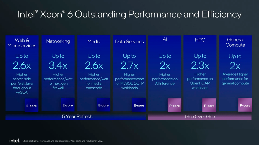 Intel Xeon 6 — это не одна «линейка ради нового названия», а сразу несколько семейств процессоров под одним брендом, которые отличаются архитектурой, целевыми задачами, платформой и масштабированием. Внутри Xeon 6 сосуществуют решения для компактных entry-серверов и филиалов (Xeon 6300), универсальные mainstream-серверные SKU (Xeon 6500/6700 с P-cores), максимально «тяжёлые» CPU для двухсокетных узлов высокой производительности (Xeon 6900 с P-cores) и отдельная ветка под плотность и экономику vCPU (Xeon 6700 с E-cores). |