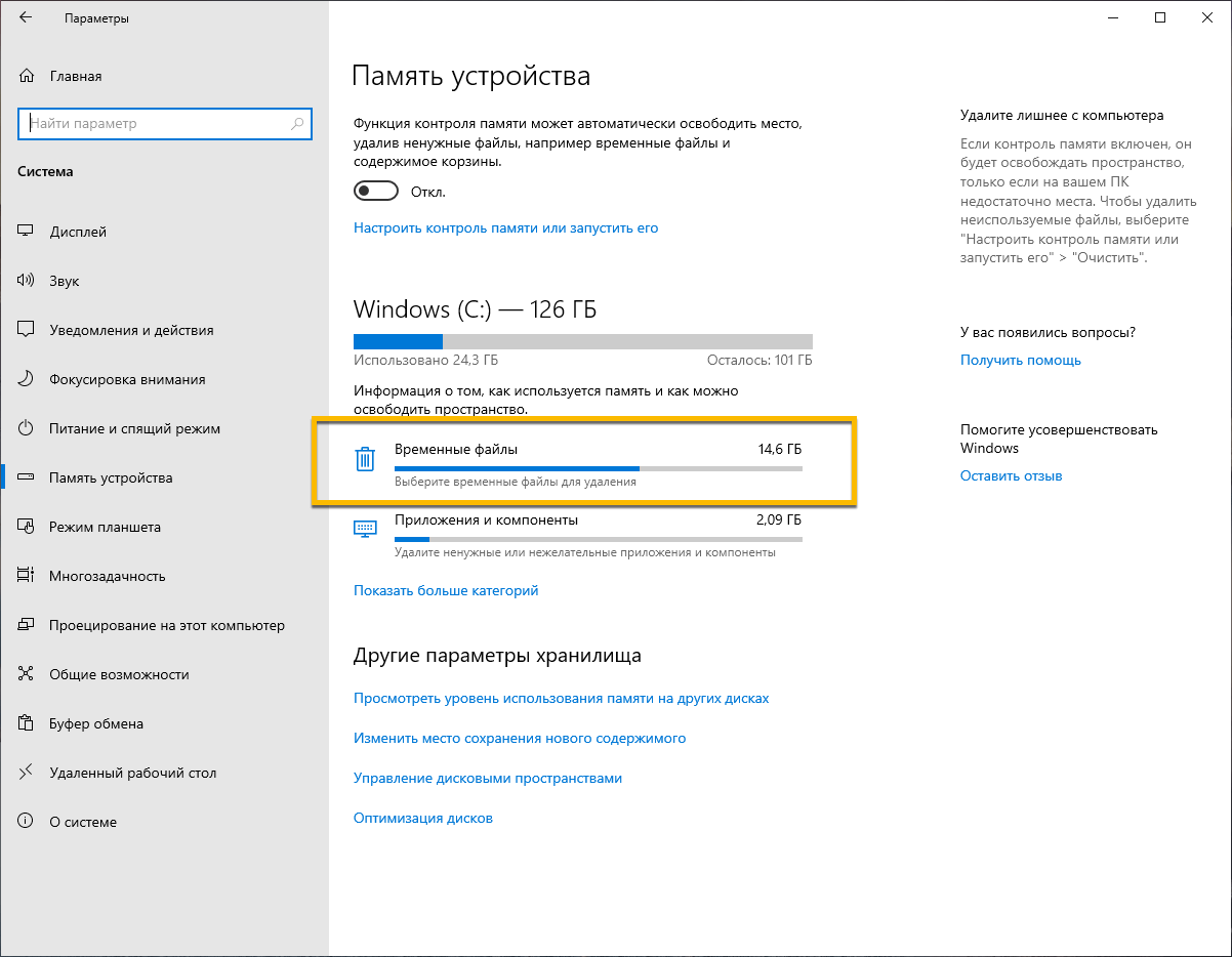 Память устройства и Рекомендации по очистке как раз полезны тем, что показывают часть системных категорий в более понятном виде. Если в проводнике ничего очевидного нет, а Windows всё равно сообщает о нехватке места, первым делом нужно проверить именно раздел хранилища.