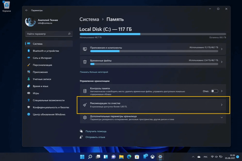 Если Windows показывает рекомендации по очистке, системные элементы лучше убирать через штатные механизмы: Параметры, Рекомендации по очистке, Временные файлы, Очистка диска. Именно эти инструменты рассчитаны на безопасную работу с системными данными.