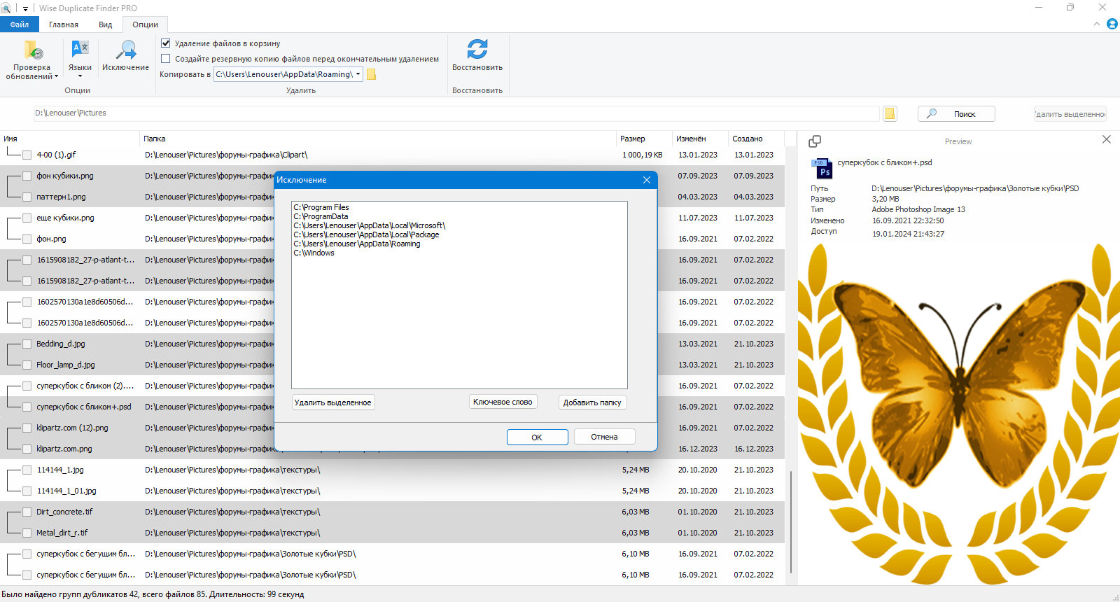 Для многих домашних сценариев Wise Duplicate Finder удобнее, чем PowerShell: добавили папку, выбрали режим сравнения, посмотрели группы, удалили в Корзину. Плюс наличие Restore и резервного копирования делает программу психологически безопаснее для тех, кто боится ошибиться.