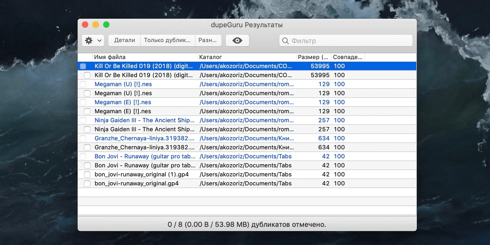 dupeGuru остаётся одним из самых удачных инструментов для тех, кому нужны не только точные копии, но и похожие имена, музыка и изображения. Официальный сайт описывает несколько сильных сторон сразу: программа сканирует либо имена файлов, либо содержимое, умеет fuzzy matching для похожих имён, имеет отдельный Music mode для работы с тегами и Picture mode для похожих изображений, а также даёт безопасную систему группировки и reference directory, чтобы не удалить лишнее. В результатах доступны сортировка и фильтрация, а найденные копии можно не только удалять, но и переносить или копировать.