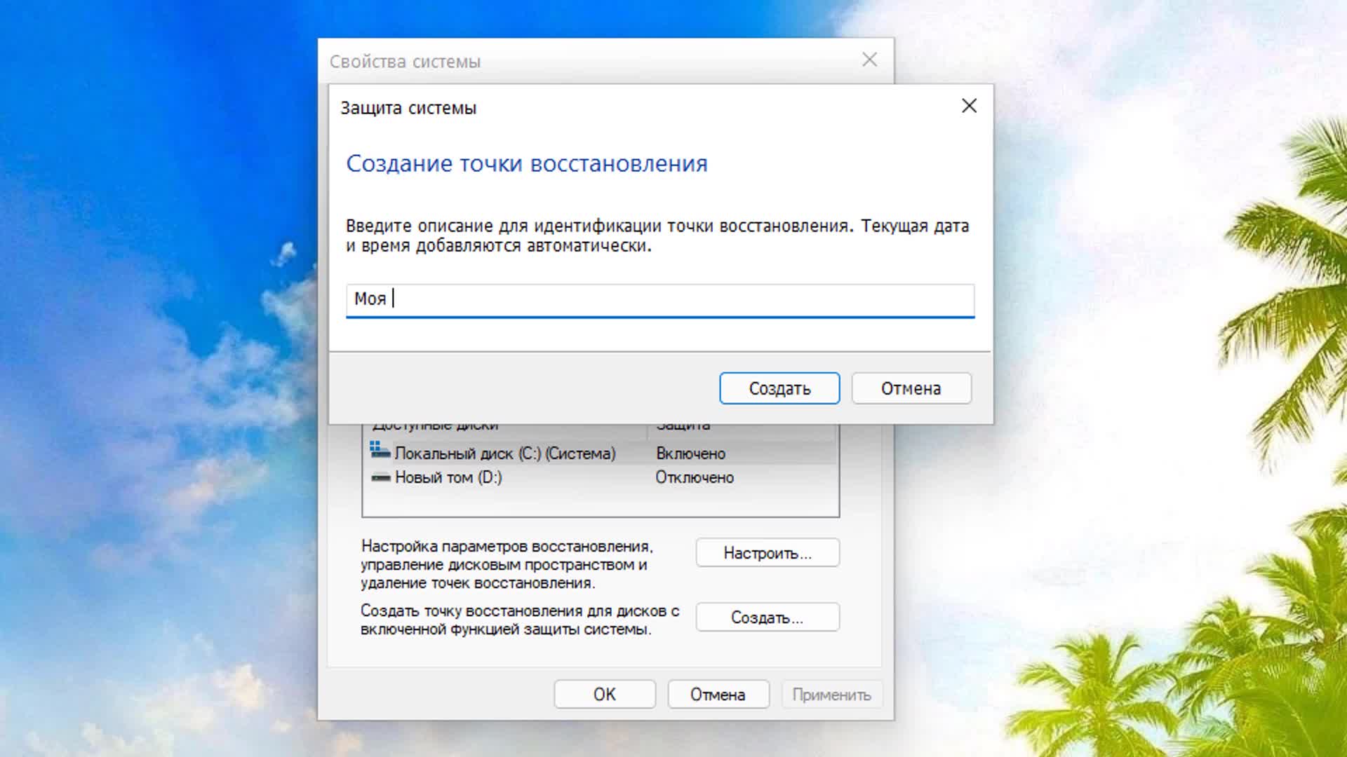 Откройте меню Пуск и начните вводить: Создание точки восстановления.