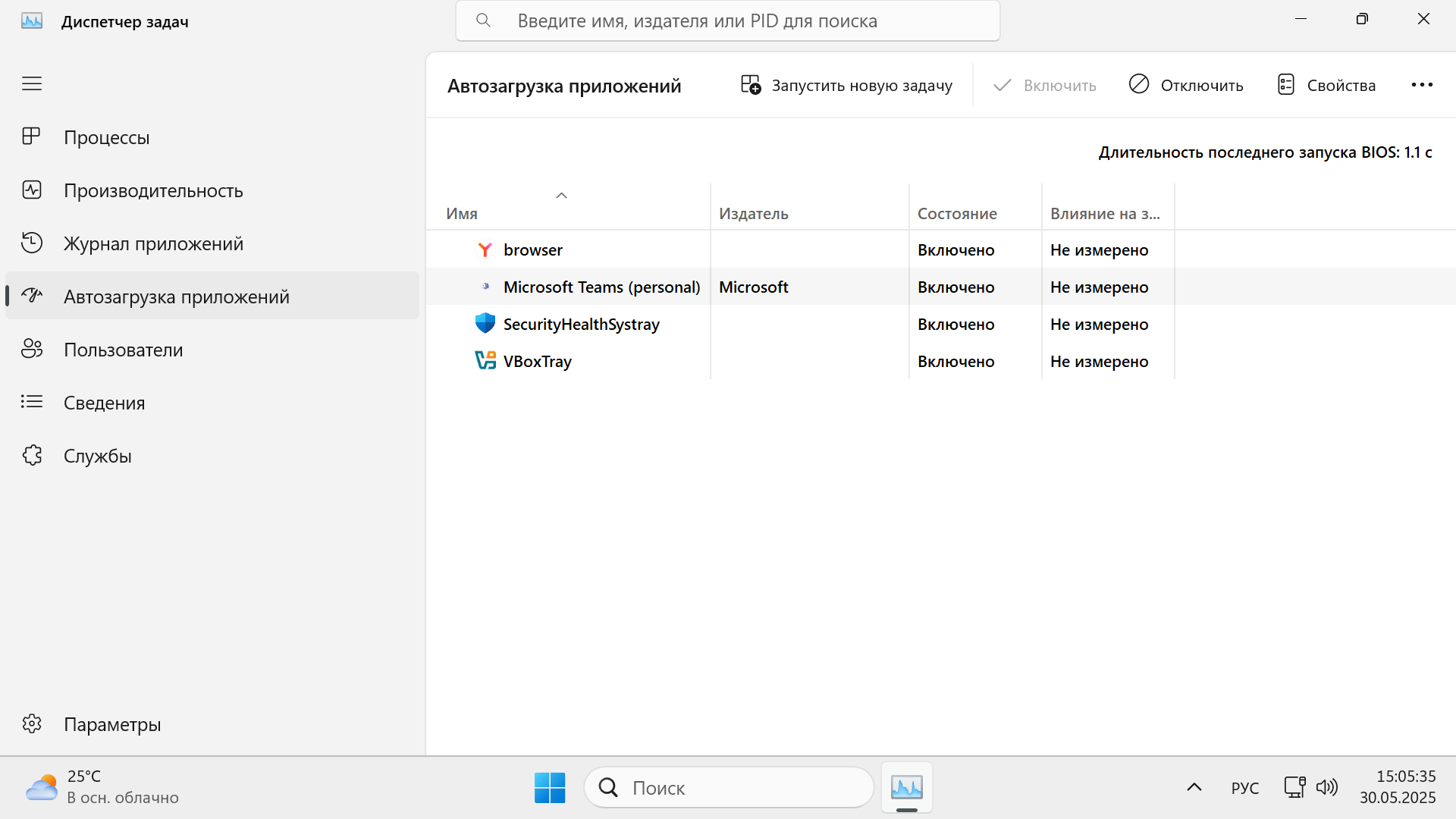 Проверьте результат в Диспетчере задач → Автозагрузка, чтобы видеть влияние на запуск.