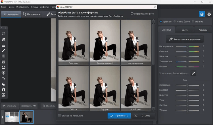 Для большинства пользователей лучший выбор — ФотоМАСТЕР. Он не сводит задачу к тупому преобразованию формата, а позволяет быстро привести RAW в порядок и сразу сохранить его в JPEG с понятными настройками.