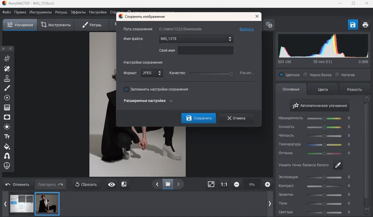 Если файл темный, пересвеченный, холодный по цвету или шумный, не переводите его в JPEG вслепую. Сначала выполните базовую коррекцию, потом экспортируйте. -