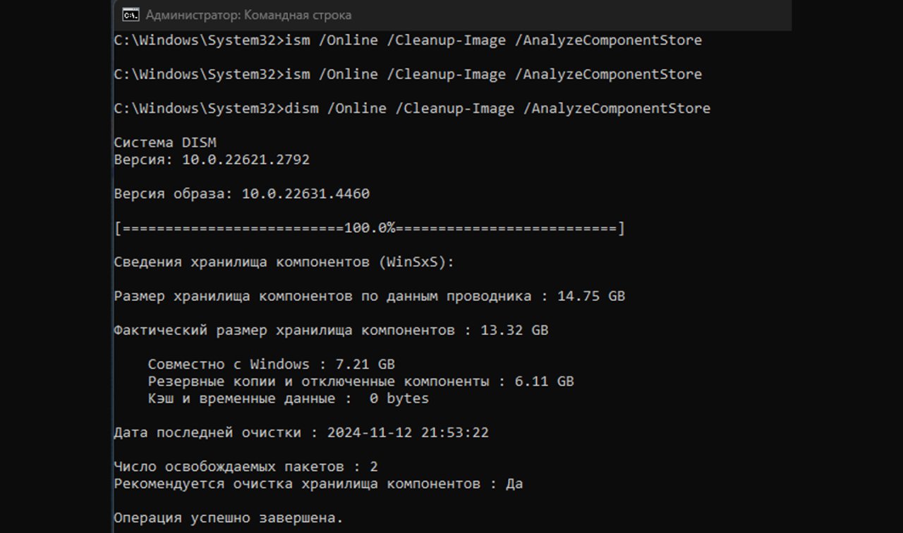 | Много места съедает «система» | DISM | AnalyzeComponentStore → StartComponentCleanup |