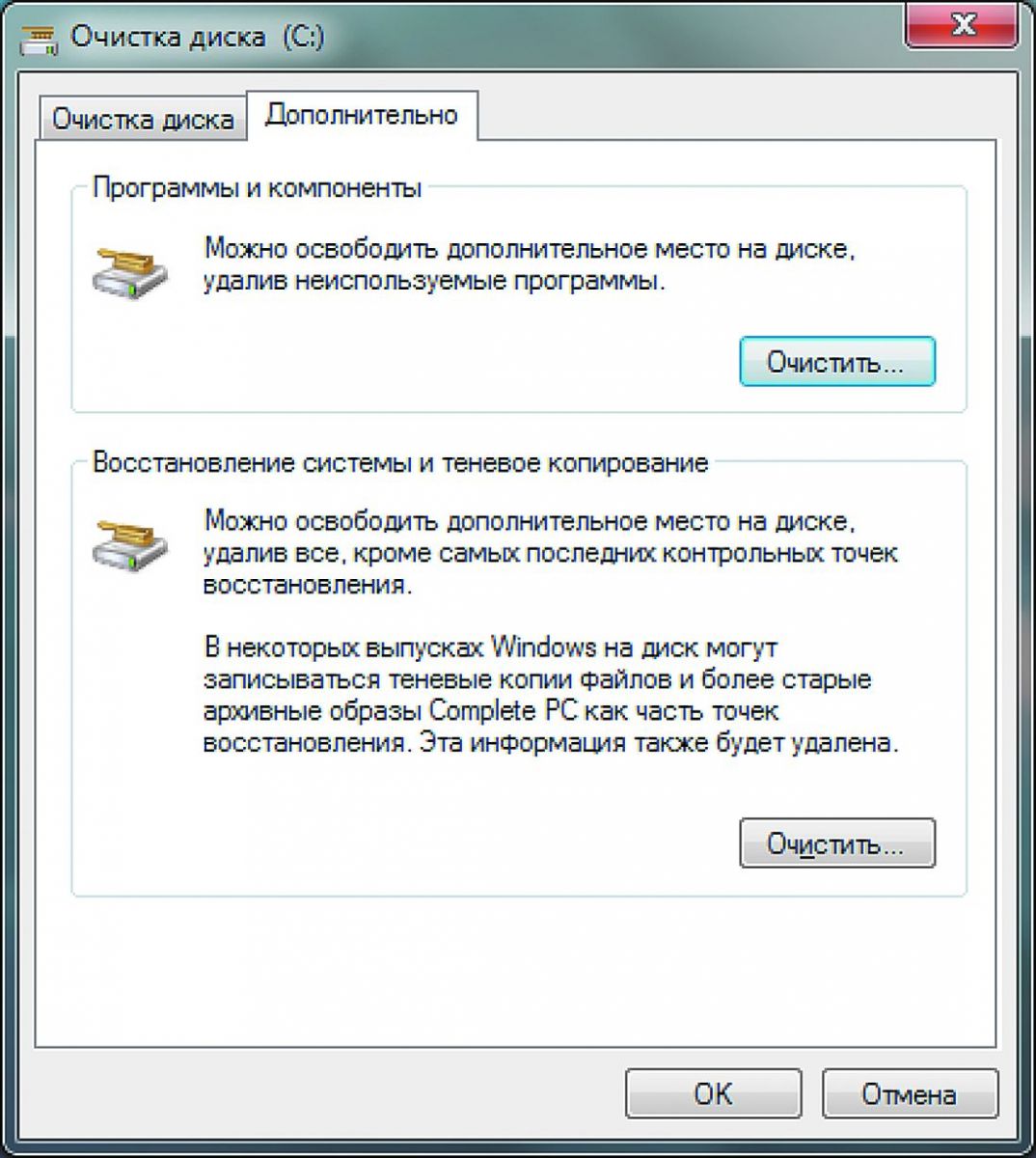 Очистка диска (cleanmgr) + Очистить системные файлы.