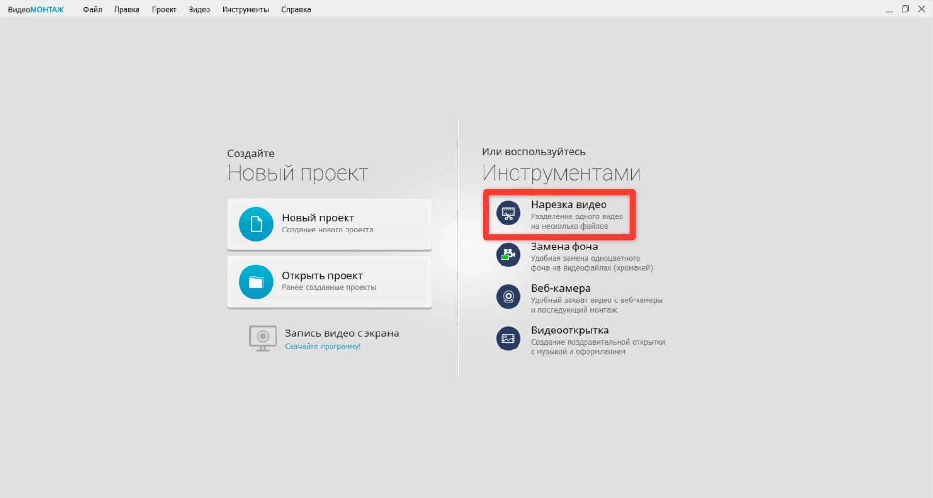 После запуска программы откройте инструмент Нарезка видео.