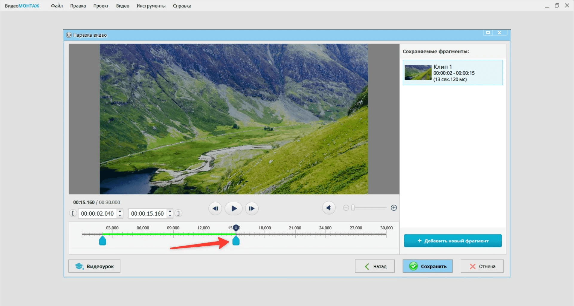 Ключевой момент здесь — кнопка Новый фрагмент. Именно она отличает обычную обрезку от нормального разбиения на части. Пока вы не добавили новый фрагмент, вы просто выделяете один участок. Как только добавляете следующий, программа начинает воспринимать ролик как набор отдельных сохраненных интервалов.