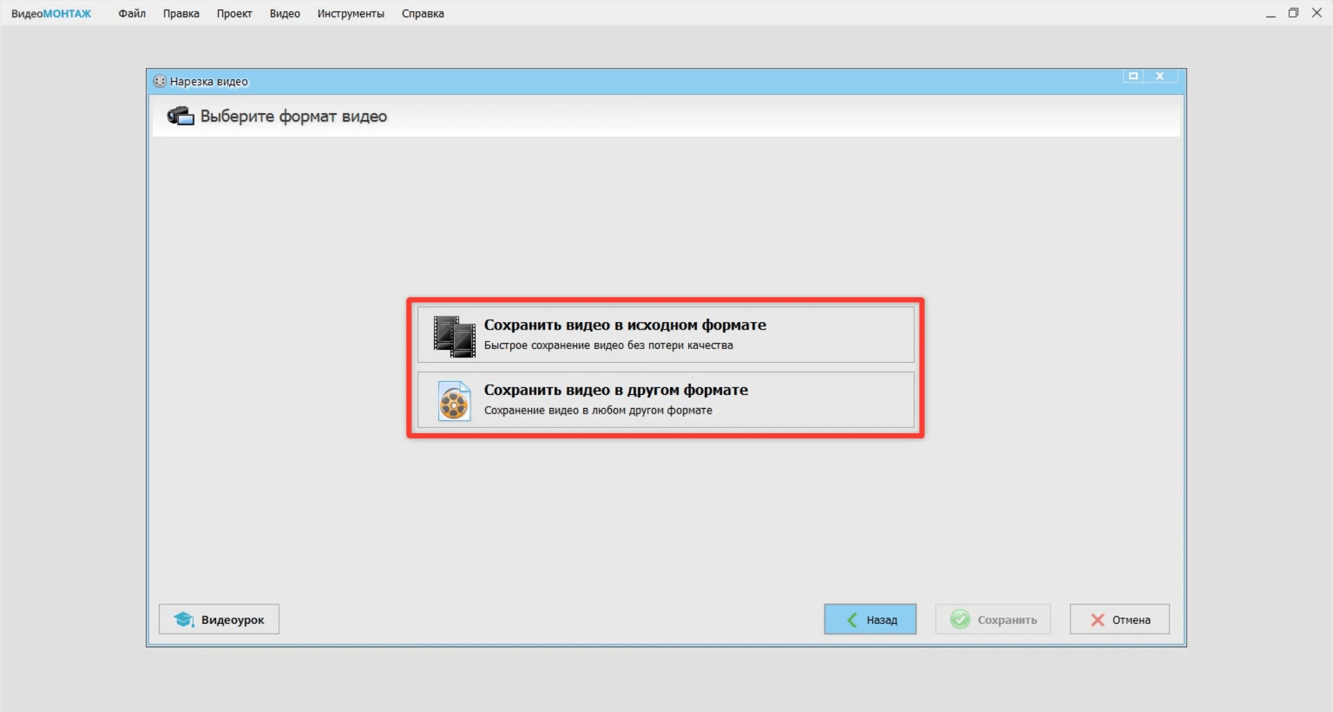 Выберите способ сохранения: в исходном формате или с перекодированием в другой формат.