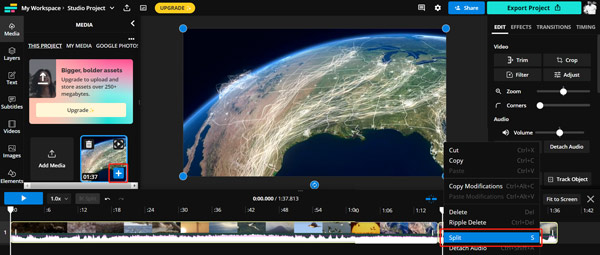 Kapwing — удобный браузерный вариант для тех, кто хочет именно разделять видео по временной шкале, а не просто двигать ползунки начала и конца. В сервисе выделен инструмент Split Video, что сразу делает его удобным для многократных разрезов.