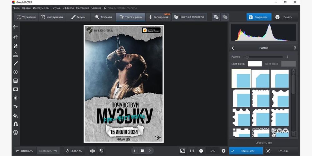 Если вам нужен понятный десктопный способ без длинного входа в сложный дизайн-софт, ФотоМАСТЕР — один из самых прямых вариантов. Он подходит именно для сценария, когда афиша строится на фотографии или арт-фоне, а затем поверх добавляются надписи, рамки и дополнительные декоративные элементы. У сервиса есть версия для Windows и Mac, а в самой программе есть цветокоррекция, удаление лишнего, эффекты, текст, рамки и инструменты для сохранения изображения под печать. В разборе афиш на базе ФотоМАСТЕР отдельно показан маршрут через инструмент Текст и рамки и через экспорт Файл → Изменить размер и сохранить → Сохранить для → Печати.
