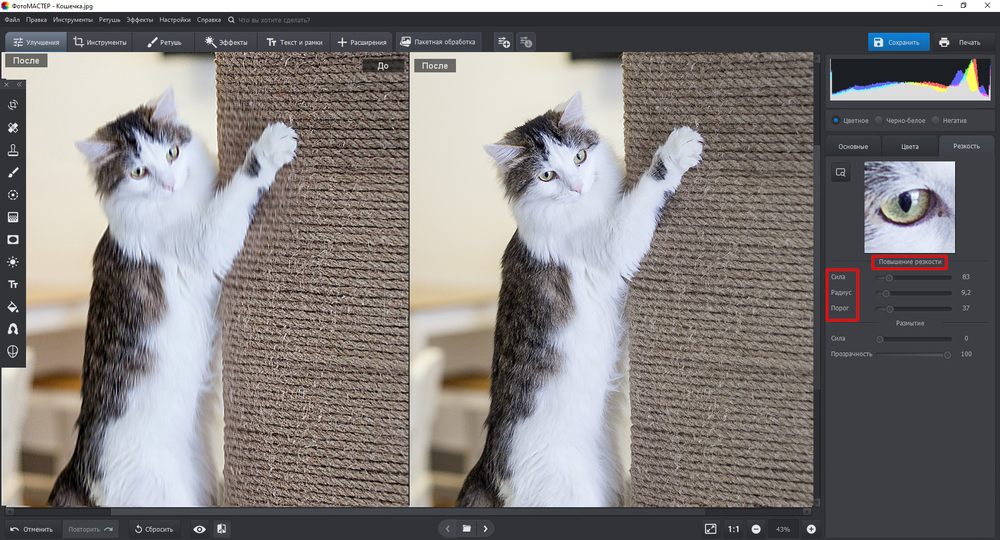 ФотоМАСТЕР я ставлю первым способом для ПК, потому что именно он чаще всего используется как базовый вариант для домашней и полупрофессиональной обработки. Здесь удобно сочетать обычное повышение резкости, локальные коррекции и быструю ручную правку без перегруза интерфейса.