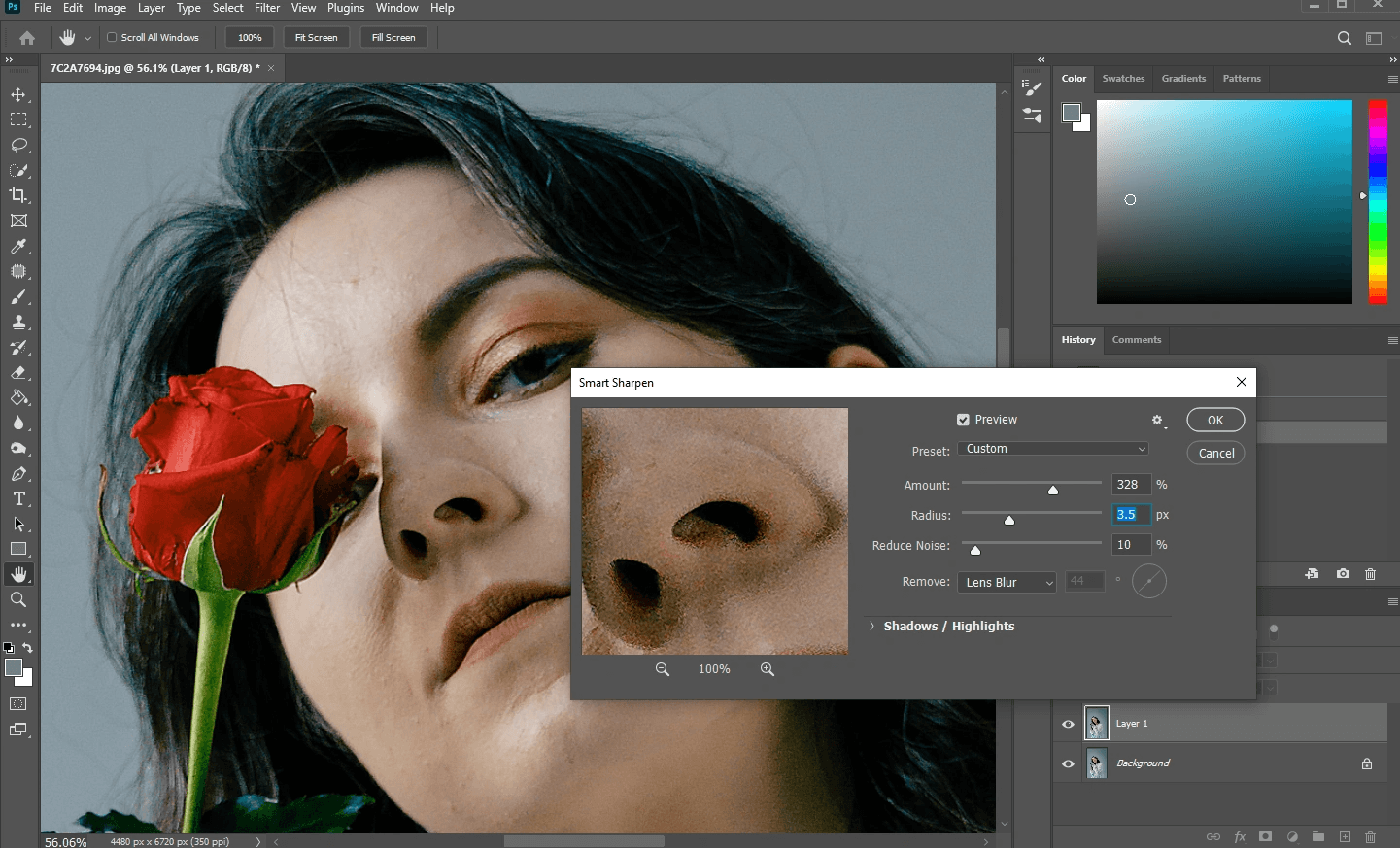 Сначала поднимайте резкость понемногу. На практике лучше несколько раз добавить по чуть-чуть, чем один раз выстрелить на максимум. Сильный перешарп сразу убивает кожу, превращает волосы в ломкие контуры и делает ореолы по краям объектов.