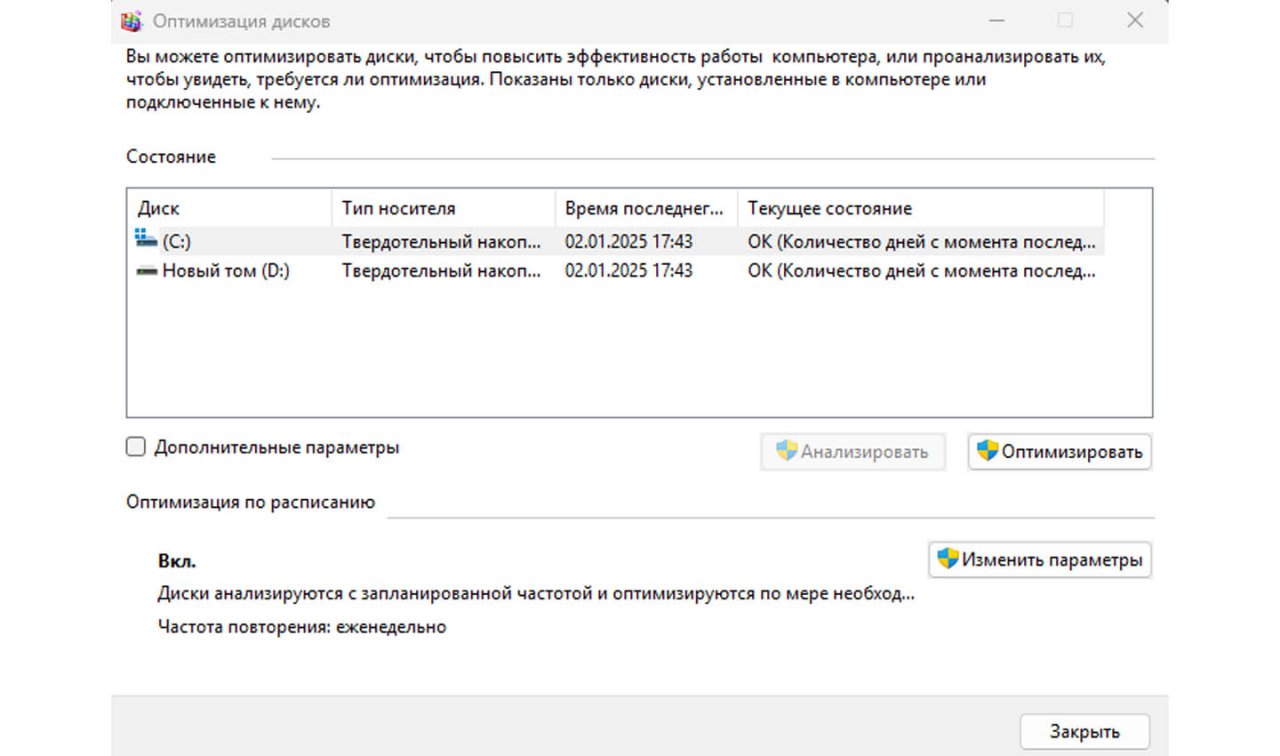 Оптимизация дисков → запуск обслуживания.