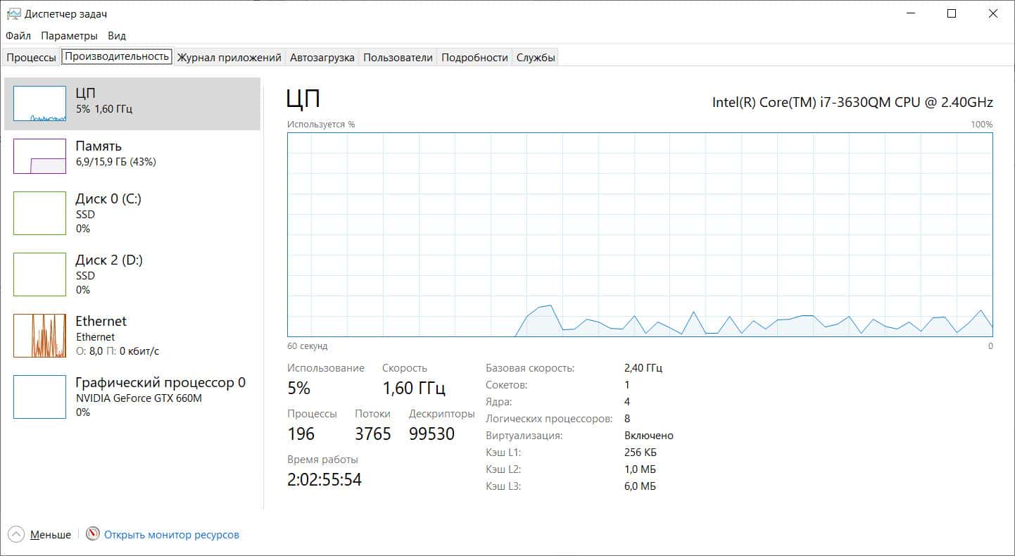 Диспетчер задач → Производительность → ЦП → проверка частоты под нагрузкой.