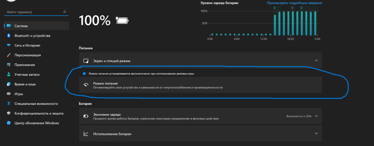 Питание → режим производительности при работе от сети.