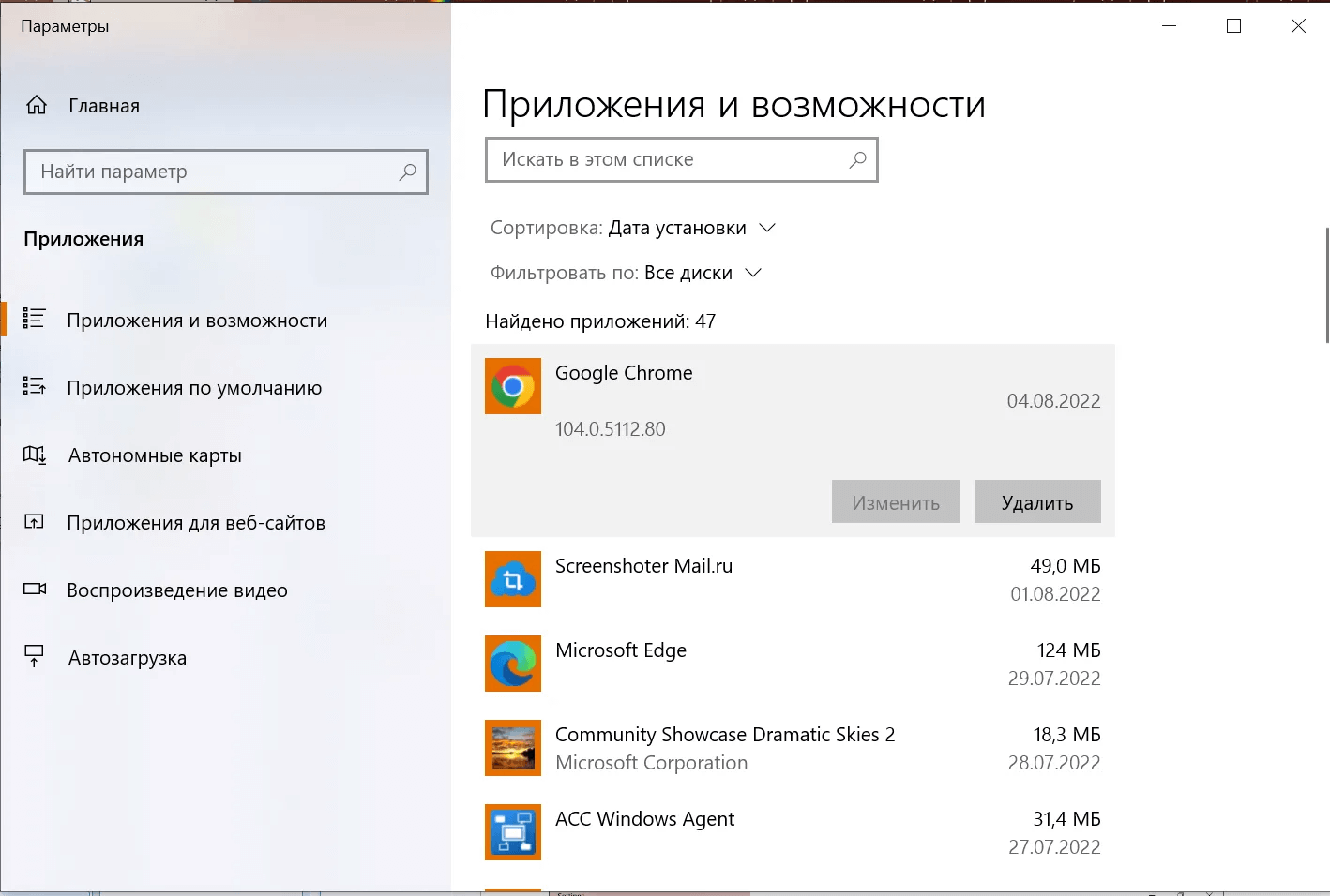 Параметры → Приложения → Приложения и возможности (Windows 10)