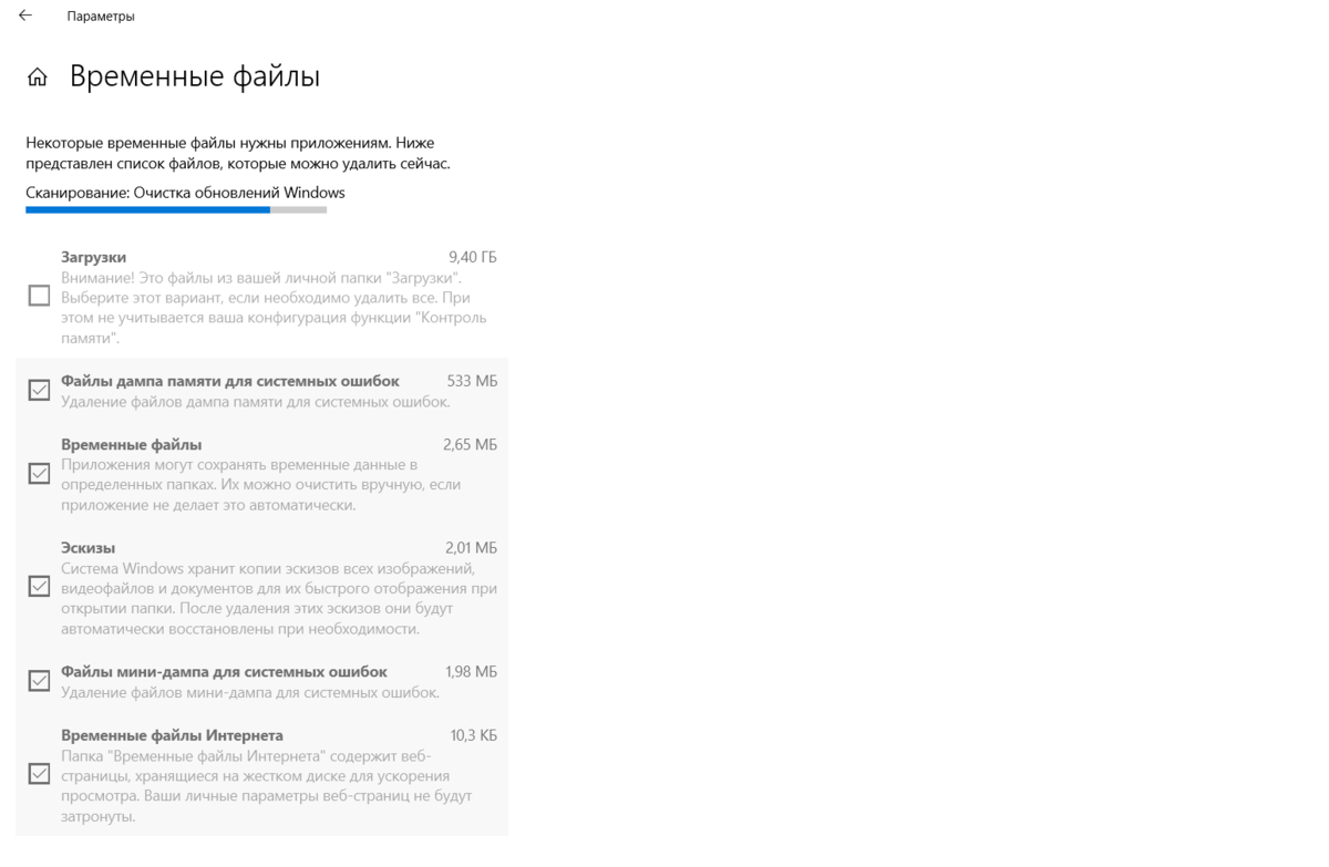 Параметры → Система → Память → Временные файлы → очистка.