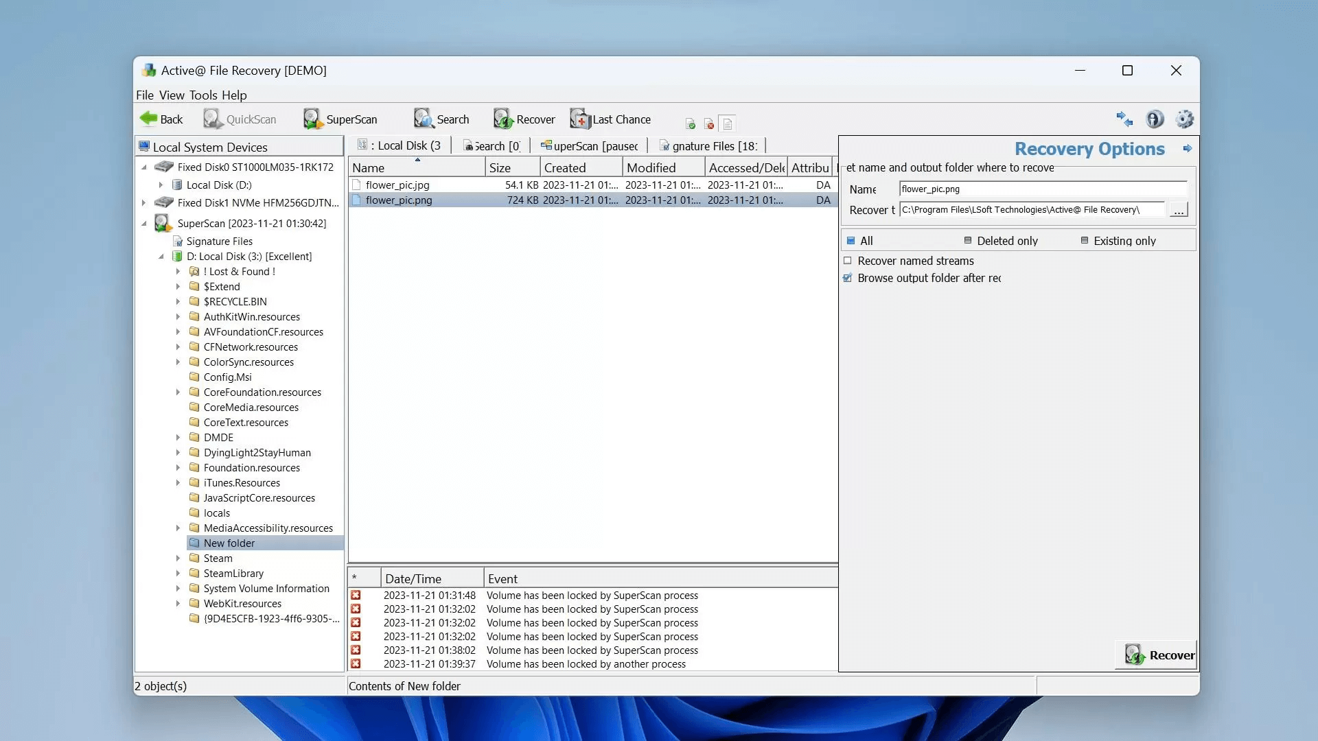 Восстановление всегда выполняется с сохранением результата на другой диск: внешний HDD/SSD, флешка, сетевое хранилище или другой раздел. -