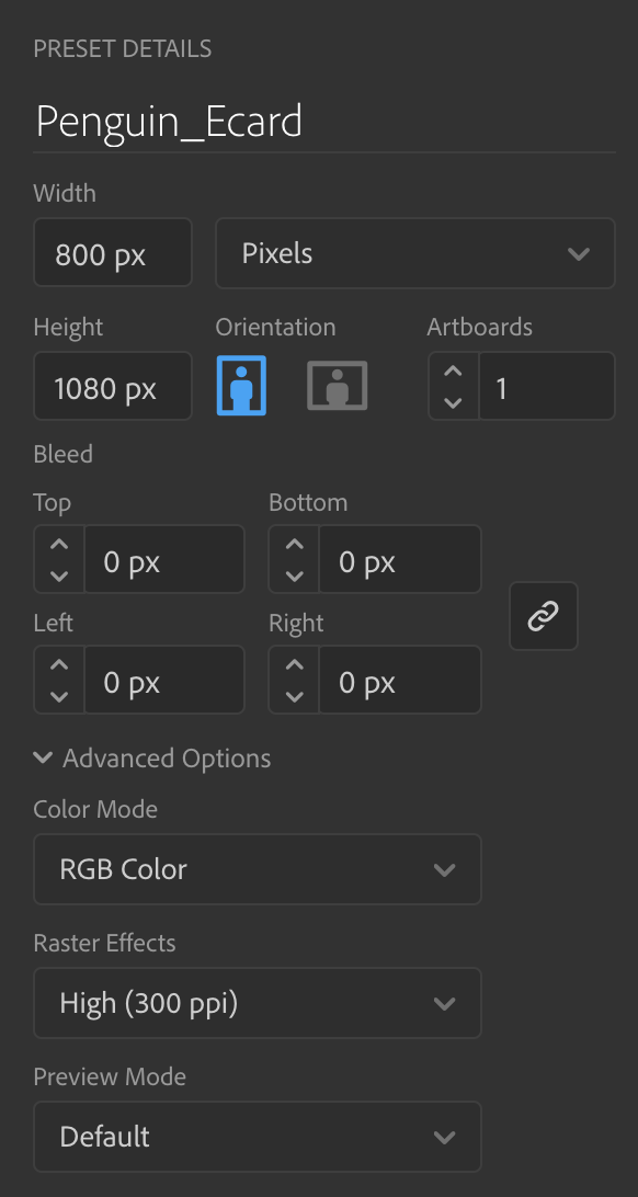 Ниже — пример, как выглядит блок настроек пресета в New Document (размер, единицы, ориентация, артборды, color mode):