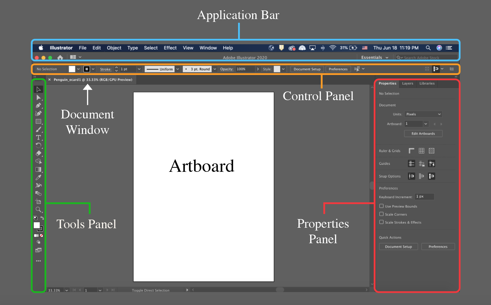 Illustrator кажется перегруженным, пока вы не разложите его на понятные блоки. В типичной конфигурации (например, Essentials) вы видите: