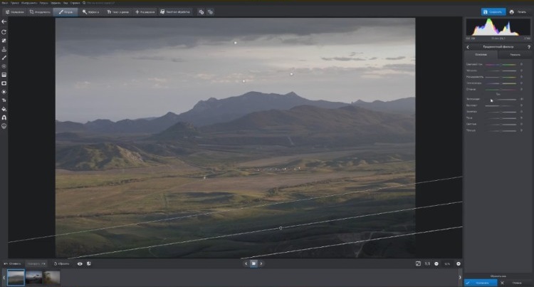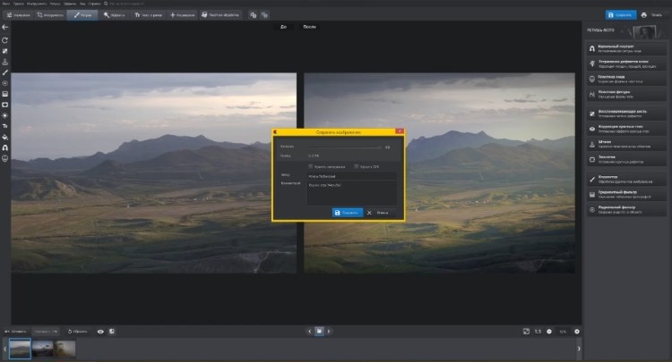 После запуска логика простая: загрузить фото → править модулями сверху → контролировать параметры справа → сохранить.