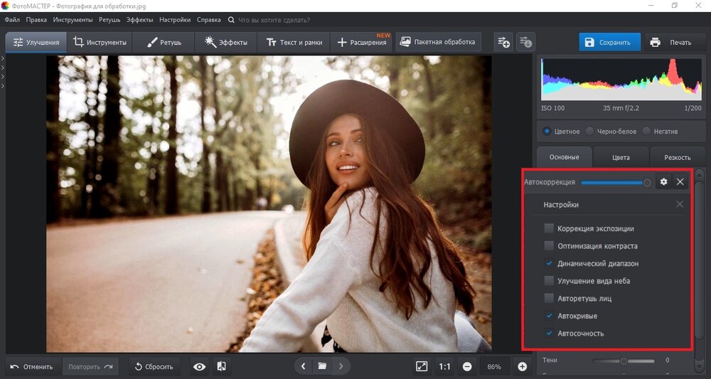 В блоке настроек «Автокоррекция» доступны чекбоксы, включая «Динамический диапазон», «Автокривые», «Автосочность».
