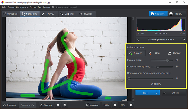 Заменить фон Инструменты → Замена фона Кисти «Объект/Фон», «Ластик», «Далее», «Применить»