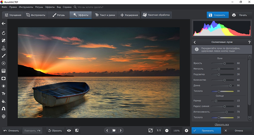 • Эффекты с параметрами, а не только «одна кнопка»: пример — «Солнечные лучи» со слайдерами.