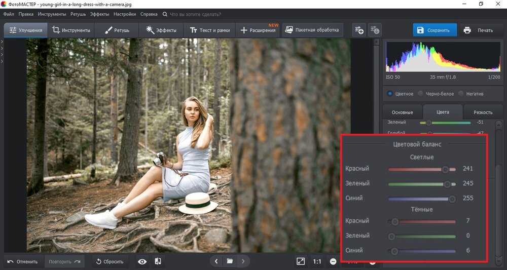 Если кадр «в целом нормальный», но хочется точнее управлять отдельными цветами (например, приглушить синий, усилить зелень, сделать кожу ровнее), переходите во вкладку «Цвета».