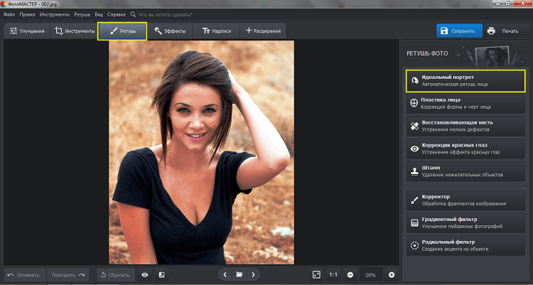 • Понятная ретушь: «Идеальный портрет» + ручные инструменты (восстанавливающая кисть, штамп, корректор).