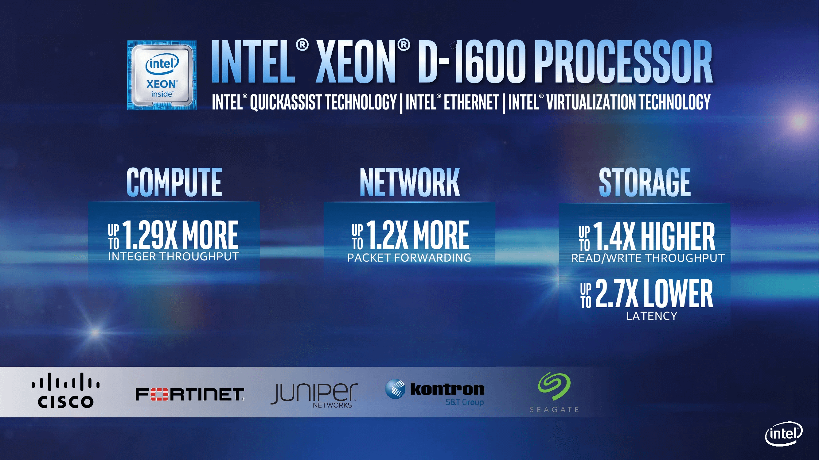 Линейка Intel Xeon D-1600 закрывает очень конкретную нишу: компактные односокетные платформы, где важны плотность, энергоэффективность, интеграция I/O, стабильная работа 24/7 и предсказуемая производительность в типичных ролях edge-сервера и сетевого appliance. Это не «урезанный Xeon», а SoC-подход, в котором процессорная часть, периферийные контроллеры и сетевые возможности собраны в одном кристалле, чтобы упростить плату и уменьшить общие требования к системе. В линейке Xeon D-1600 Intel делает ставку на высокую производительность на ядро в низкопотребляющем дизайне, а также на готовность под сетевые и storage-нагрузки за счёт интегрированного Ethernet и ускорения криптографии через Intel QuickAssist Technology (QAT) в «сетевых» SKU. В материалах по линейке зафиксировано: до +29% прироста вычислительной производительности по сравнению с предыдущим поколением Xeon D-1500 Network Series, а также интеграция до 40 Гбит/с Ethernet и до 30 Гбит/с крипто-оффлоада через QAT. |