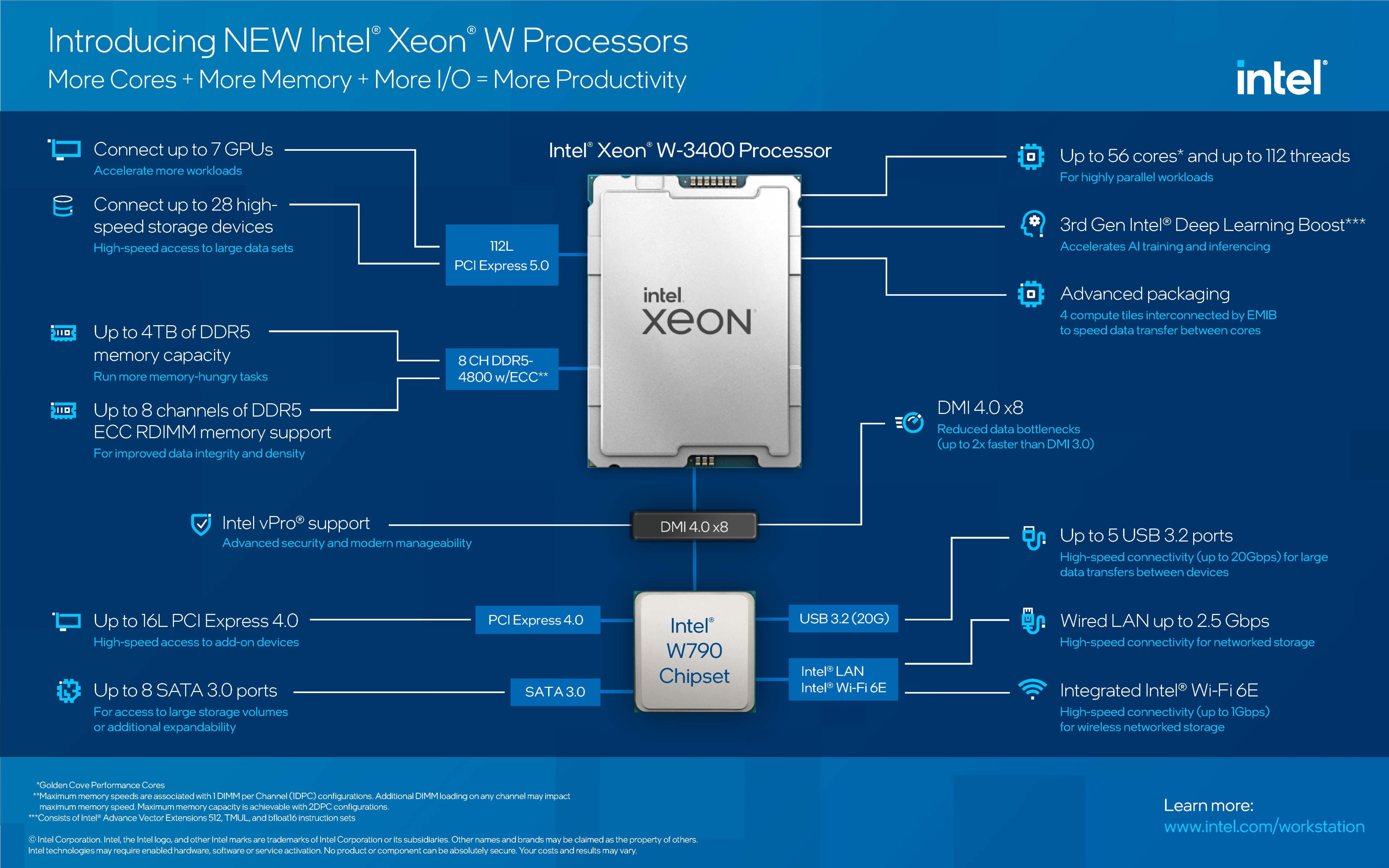| W-3300 | LGA4189 | DDR4-3200, 8 каналов | PCIe 4.0 | заметный прирост пропускной способности памяти и I/O |