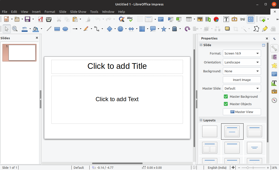 Откройте LibreOffice Impress и выберите пустую презентацию или шаблон.