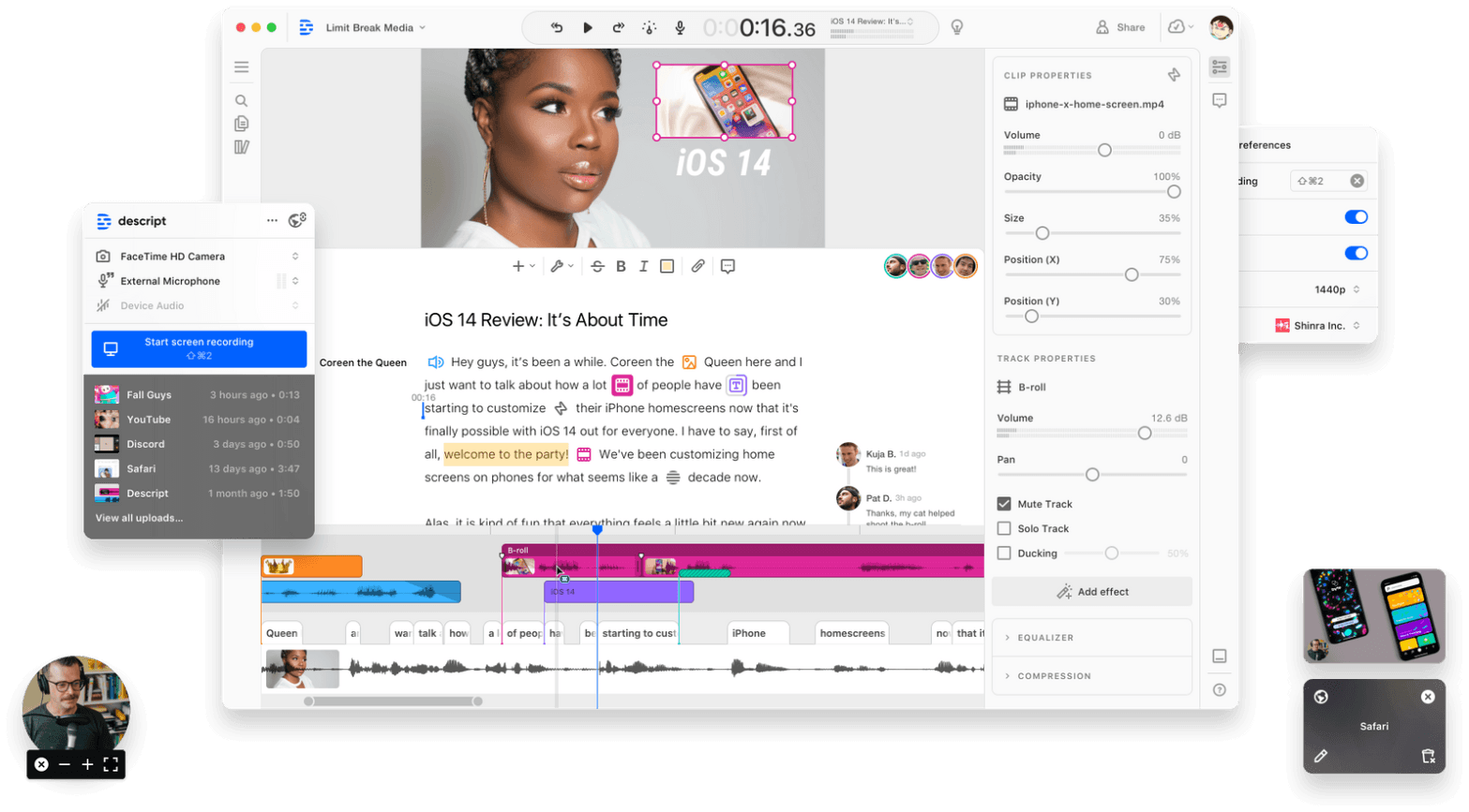 | Descript | Онлайн | Средний | Монтаж через текст, подкасты, интервью |