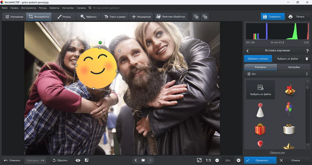Главное преимущество ФотоМАСТЕРА в такой задаче — предсказуемый рабочий процесс. Вы открываете фото, переходите к инструментам оформления, добавляете нужный элемент, затем сразу настраиваете размер, положение и визуальное соответствие кадру. Для публикаций в соцсетях это особенно удобно: можно одновременно подправить экспозицию, убрать мелкие дефекты кожи, подрезать кадр и уже потом поставить смайлик на нужную часть изображения. В результате получается не отдельная наклейка на сыром снимке, а готовая аккуратная картинка.