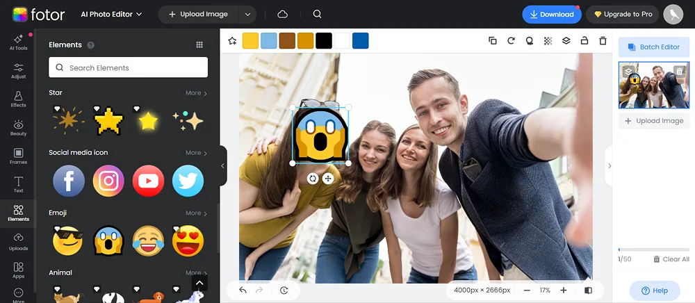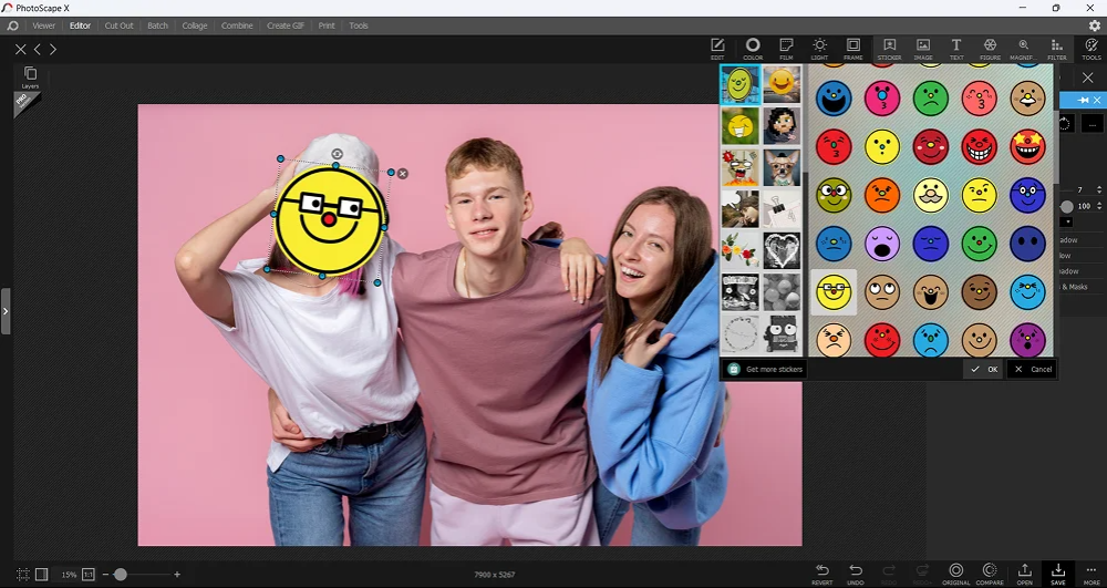 Разница между программами здесь принципиальная. Одни редакторы дают полноценную библиотеку наклеек, эмодзи, рамок и декоративных элементов. Другие работают через вставку PNG на отдельный слой. Третьи позволяют добавлять emoji как текстовый символ, а затем свободно масштабировать, поворачивать и ставить поверх фото. Для задачи закрыть лицо смайликом подходят все три сценария, но по удобству они различаются очень сильно.