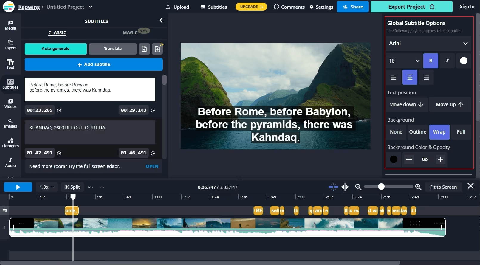 Для роликов с живой речью это один из самых удобных вариантов: программа создает текст, разбивает его по фразам, а затем дает вручную исправить ошибки распознавания. После этого субтитры можно оформить под стиль видео: выбрать шрифт, цвет, фон, размер и положение.