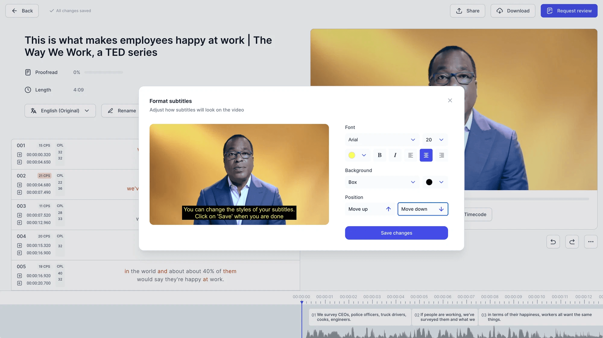 совместить субтитры с монтажом, музыкой и переходами;