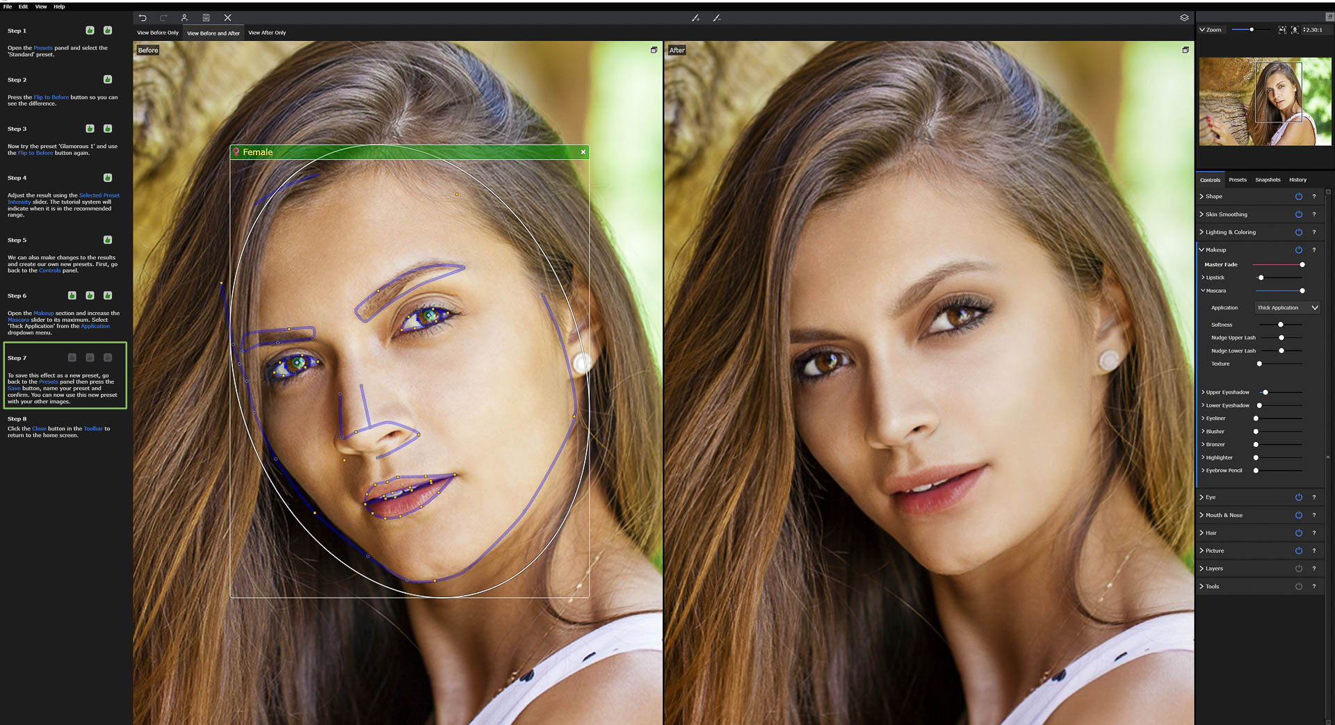 PortraitPro — это уже инструмент ближе к профессиональному классу портретной ретуши. Его ключевая особенность — автоматическое распознавание лица и очень детальная система управления чертами лица, кожей, волосами, глазами, бровями, губами и даже выражением. Программа анализирует портрет, предлагает расставить контрольные точки и после этого открывает большую панель параметров, где можно отдельно настраивать сглаживание кожи, корректировать форму носа, глаз, бровей, рта, добавлять объем волос и управлять десятками нюансов внешности. Для кожи используется технология ClearSkin, которая делает смягчение более аккуратным и менее мыльным.
