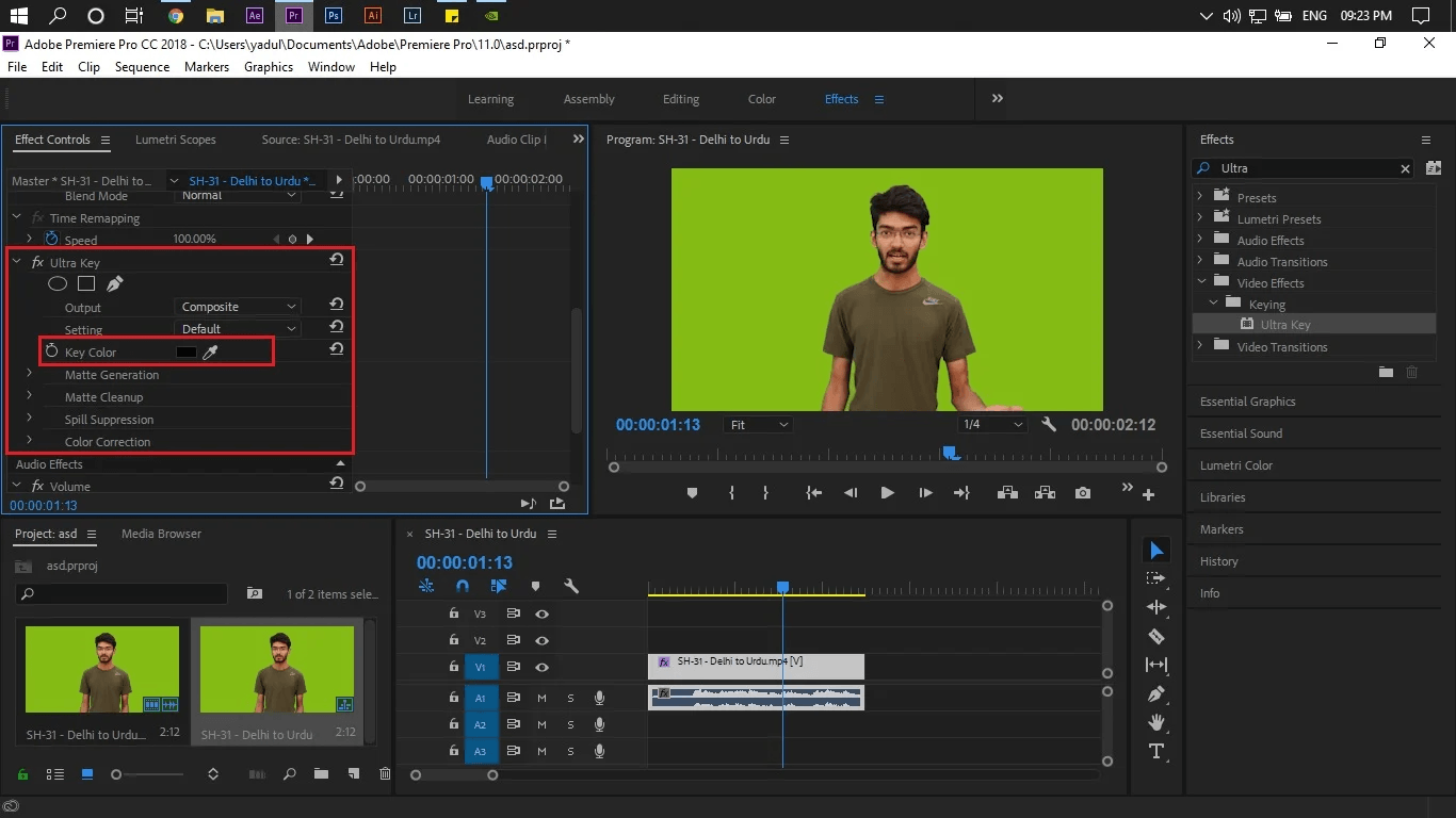 После добавления эффекта откройте Properties для слоя эффекта и настройте параметры Chroma Key.