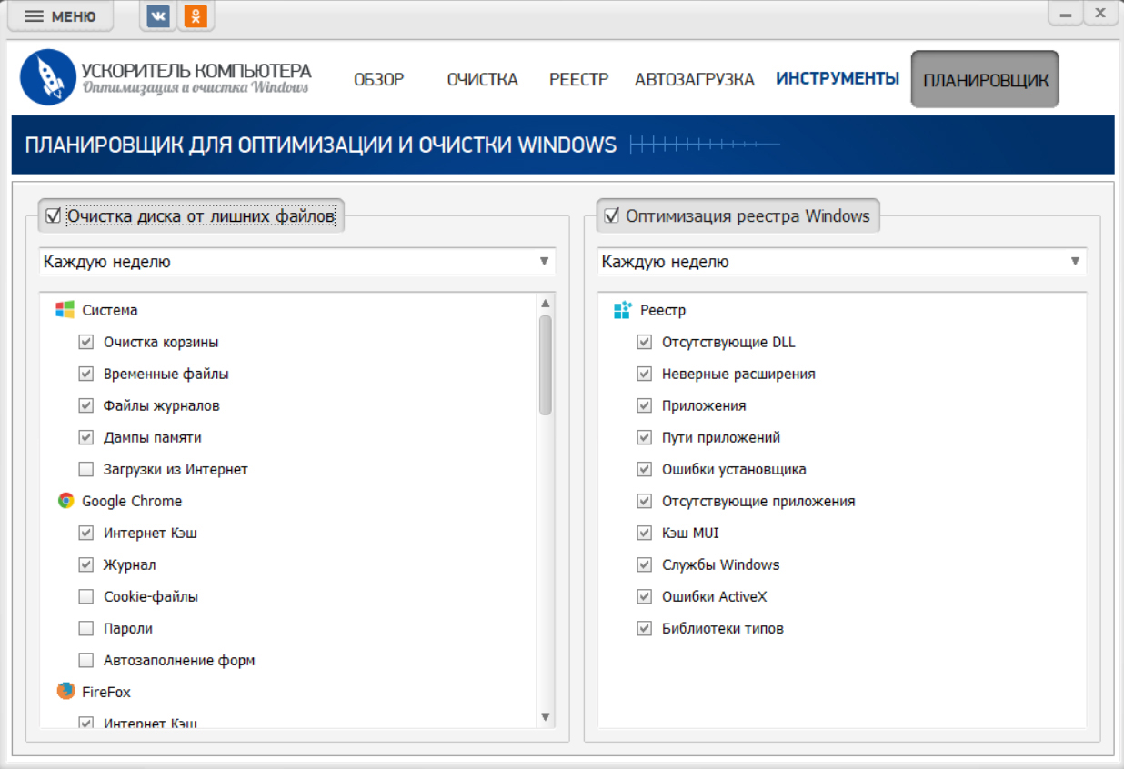 Верхняя панель вкладок: ОБЗОР / ОЧИСТКА / РЕЕСТР / АВТОЗАГРУЗКА / ИНСТРУМЕНТЫ / ПЛАНИРОВЩИК.