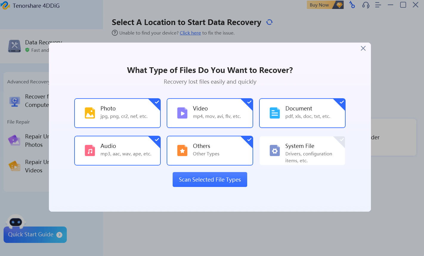 На экране Выберите опции для сканирования отметить нужные группы типов файлов.