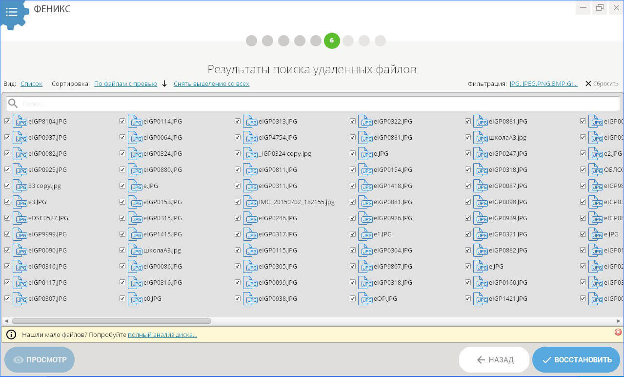 На экране Результаты поиска удаленных файлов использовать строку Введите текст для поиска..., поставить чекбоксы у нужных файлов.