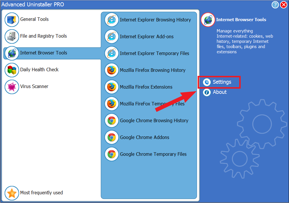 Advanced Uninstaller PRO даёт отдельные панели для трёх браузеров (Internet Explorer, Mozilla Firefox, Google Chrome). В каждом случае логика одинаковая: есть модуль истории (Browsing History), модуль расширений (Add-ons / Extensions) и модуль временных файлов (Temporary Files).