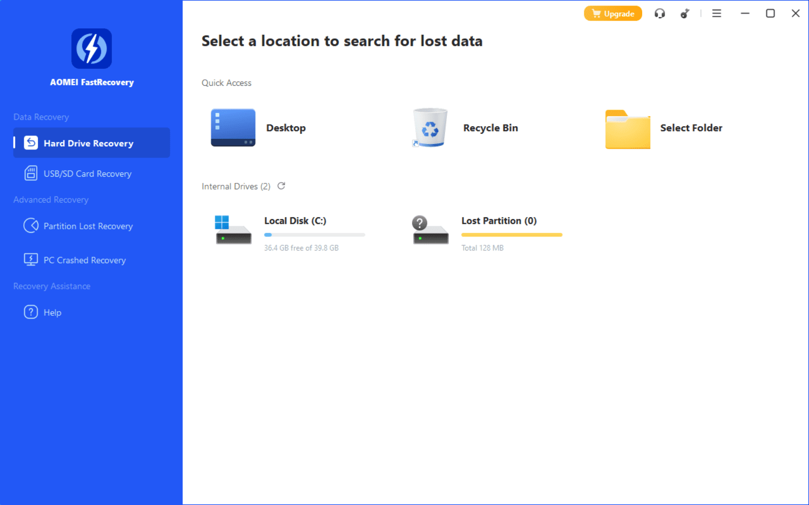 Главная идея интерфейса AOMEI FastRecovery — не заставлять пользователя выбирать «тип сканера», а сразу дать сценарии: