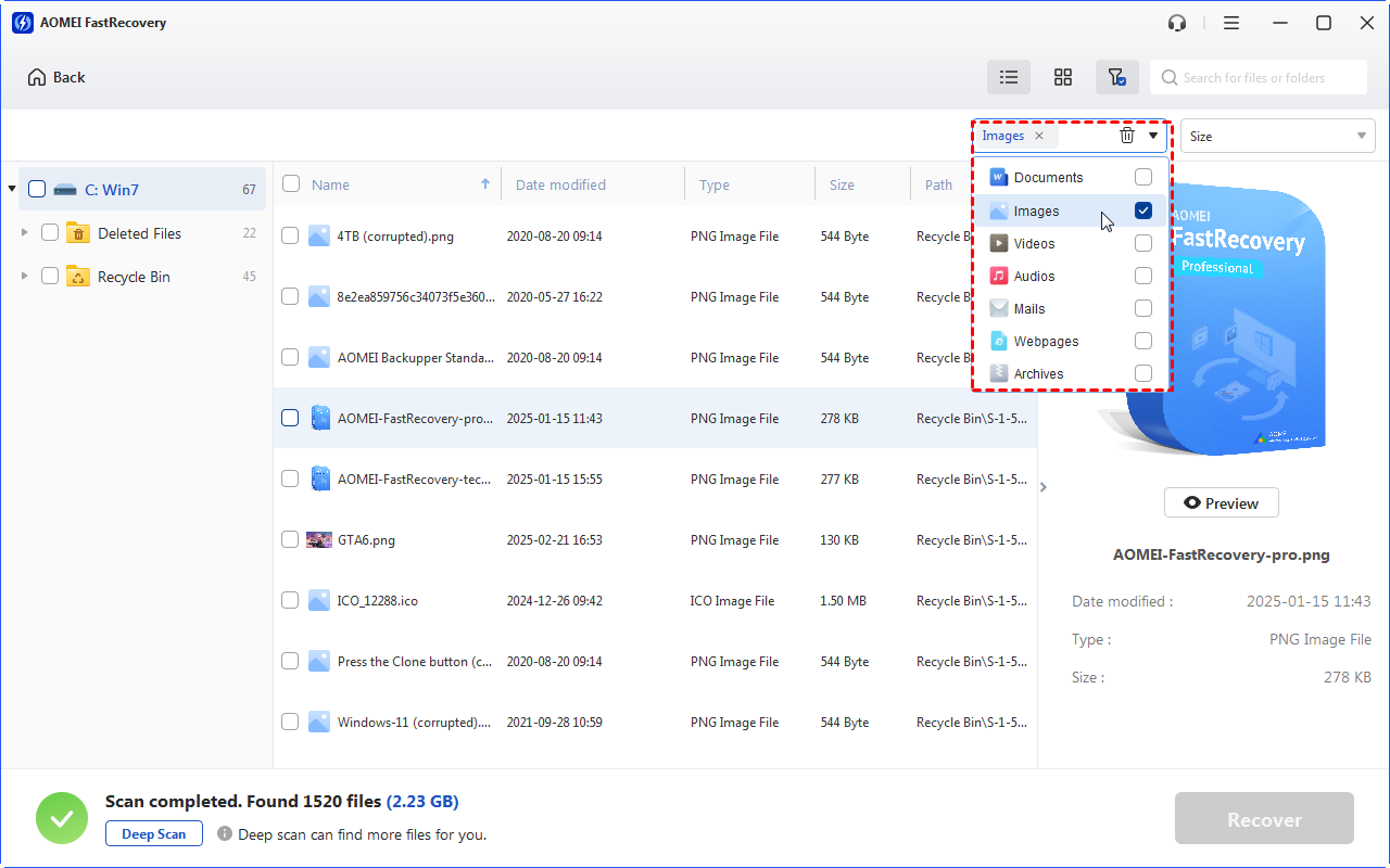 Большая часть «успеха» восстановления в реальности — это не сам факт сканирования, а правильный отбор того, что действительно нужно. В AOMEI FastRecovery эта часть сделана практично.