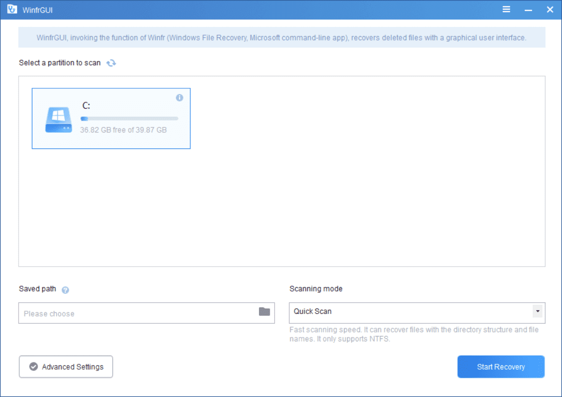 AOMEI WinfrGUI — практичный вариант для тех, кто хочет восстановление удалённых файлов в Windows без ручного ввода команд winfr. Программа берёт сильные стороны Windows File Recovery и делает управление прозрачным: Select a partition to scan, Save path, Scanning mode, Advanced Settings, Start Recovery.