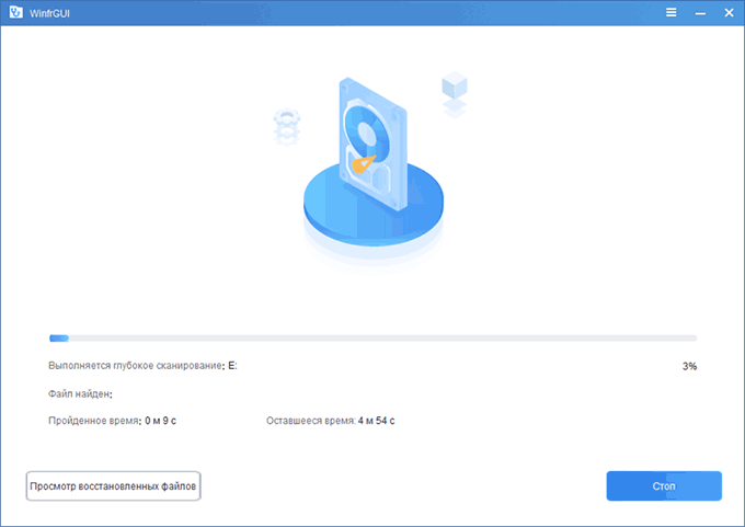 Нажимаете Start Recovery — WinfrGUI запускает процесс, а восстановленные данные записываются в выбранную папку сохранения.